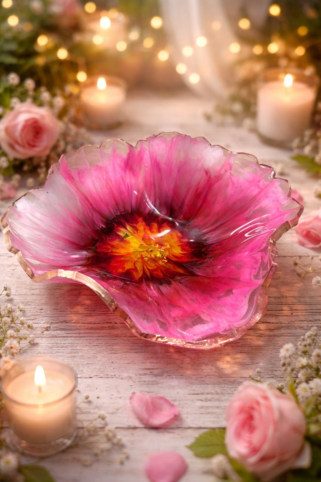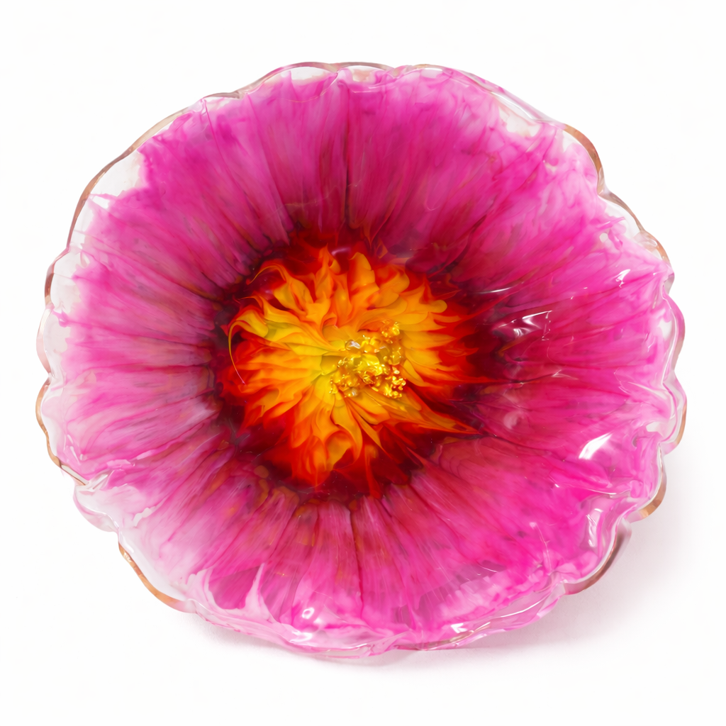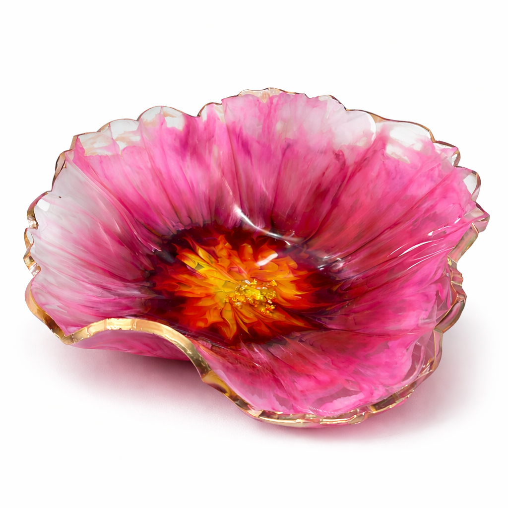 Diese Dekoschale ist in liebevoller Handarbeit aus Epoxidharz gefertigt und ein echtes Einzelstück. Ihre Form erinnert an eine geöffnete Blüte und macht sie zu einem besonderen Blickfang – egal ob auf dem Esstisch, dem Sideboard oder im Regal.