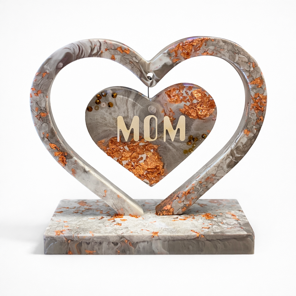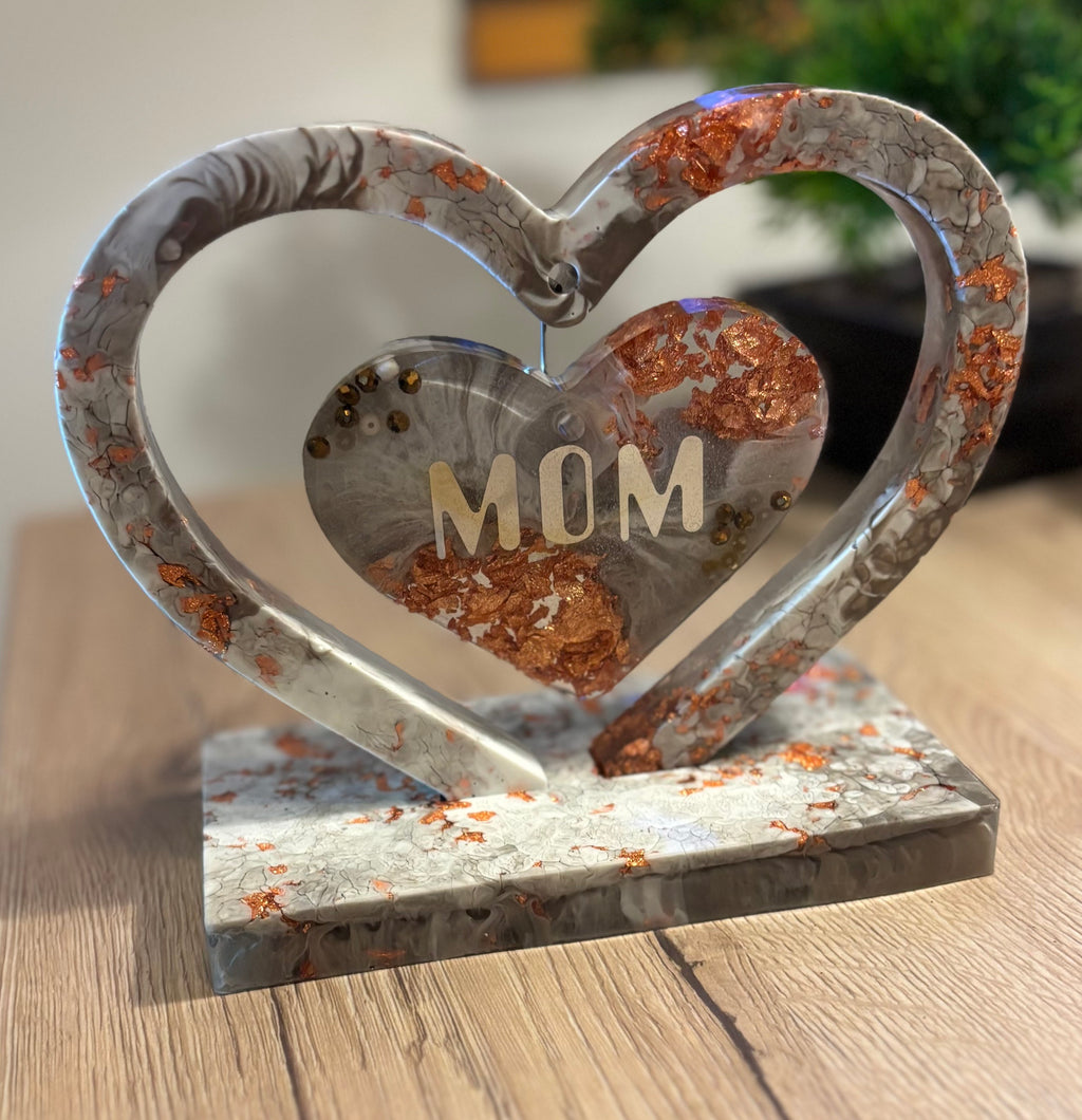 Im Inneren des Rahmens hängt ein kleineres Herz, das personalisiert werden kann. Die abgebildete Variante zeigt die Aufschrift „MOM“. Text, Farbe und Gestaltung lassen sich individuell anpassen, sodass jedes Stück nach Wunsch gefertigt wird. Das Herz steht auf einem passenden Untersatz, der das Design aufgreift und für einen sicheren Stand sorgt.