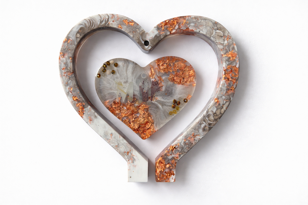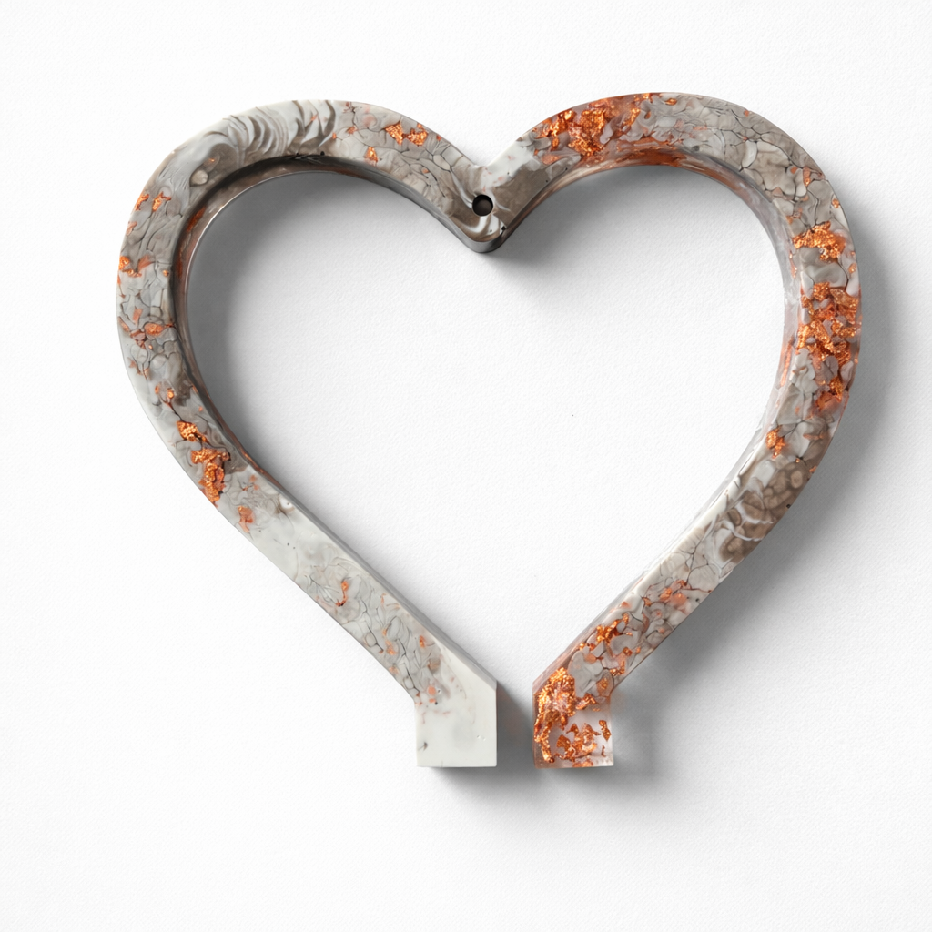 Wie auf den Fotos zu sehen, besteht der Herzrahmen aus ruhigen Grau- und Cremetönen mit fein ausgearbeiteten, organischen Strukturen. Eingearbeitete kupferfarbene Akzente setzen gezielte Highlights und sorgen für eine dezente, moderne Wirkung. Durch das Epoxidharz entsteht eine glatte, glänzende Oberfläche, die die Farbverläufe und Details gut zur Geltung bringt.
